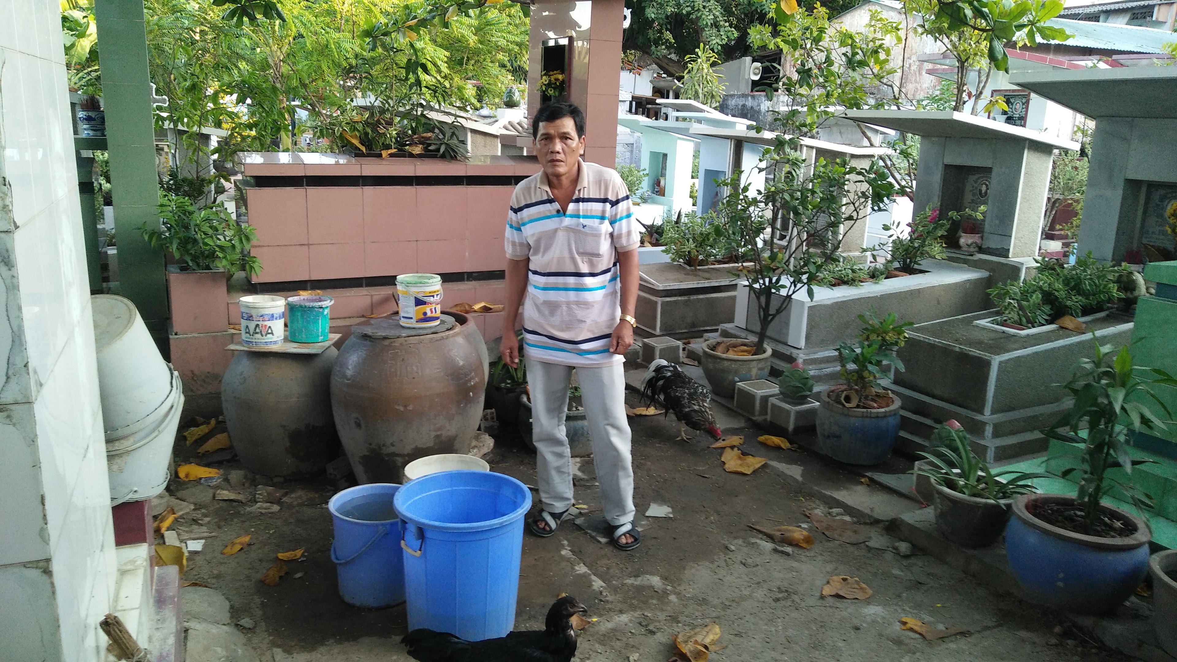 “Vào ở chung với người chết, không phải đơn giản. Tôi phải thắp nhang, khấn vái, xin họ thông cảm với hoàn cảnh mà cho tá túc. Vậy là ban ngày lang thang khắp nơi nhưng đêm đến tôi lại ngủ chung với người chết. Nơi ngủ của tôi là nền gạch giữa hai ngôi mộ hoang lạnh. Đêm nào trời mưa, tôi lại chui vào cái chòi của một người dân gần đó mà ngủ. Vậy mà đã được 26 năm rồi. Người chết, họ cũng hiểu được nên chẳng có ai phá tôi cả. Đêm nào tôi cũng ngủ ngon giấc”, ông Thắng kể.
