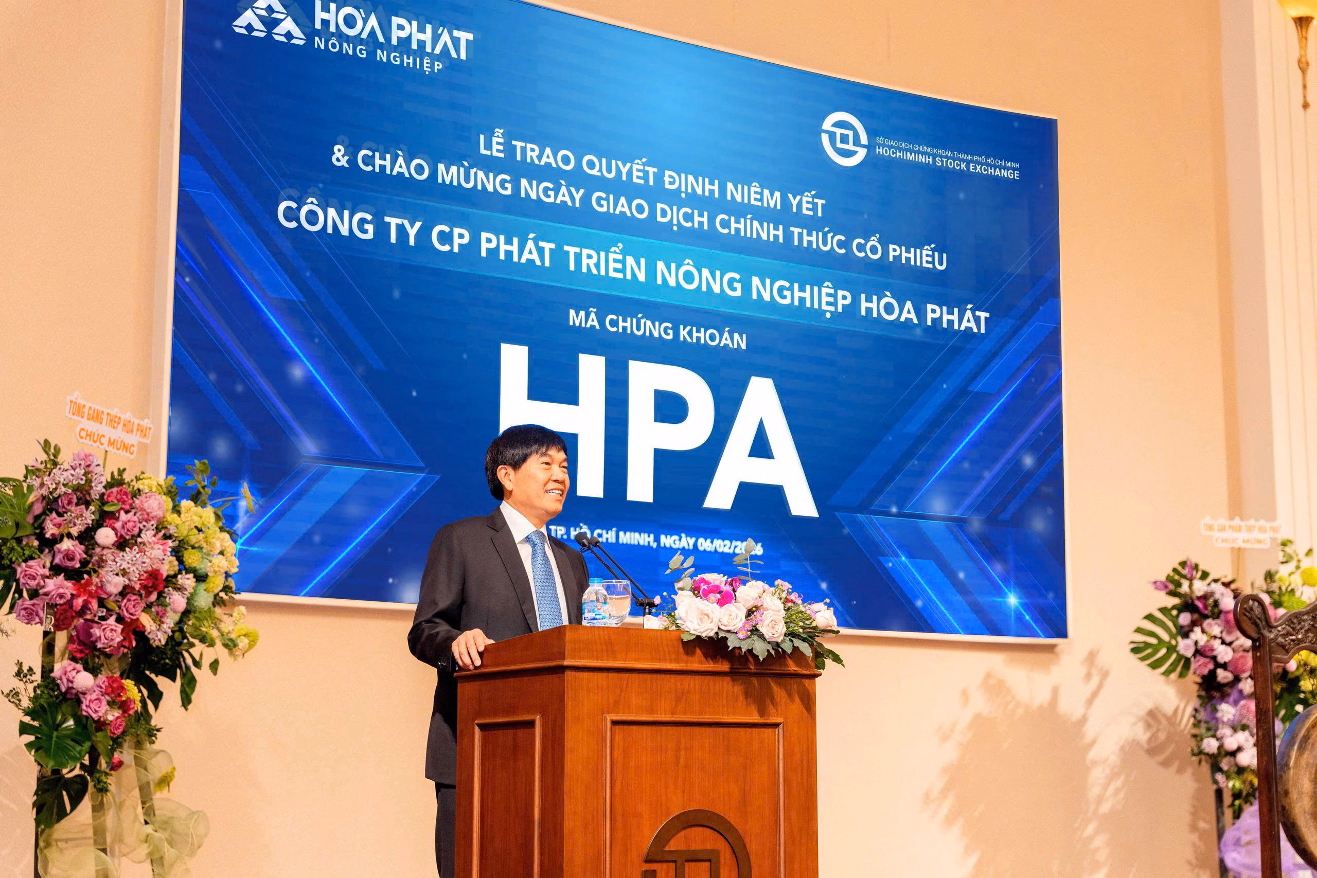 Ngày 6/2, Sở Giao dịch Chứng khoán TP. Hồ Chí Minh (HOSE) đã tổ chức Lễ trao Quyết định niêm yết cho Công ty Cổ phần Phát triển Nông nghiệp Hòa Phát (HPA), chính thức đưa 285.000.000 cổ phiếu HPA vào giao dịch trên sàn HOSE, với giá tham chiếu 41.900 đồng/cổ phiếu trong ngày giao dịch đầu tiên.