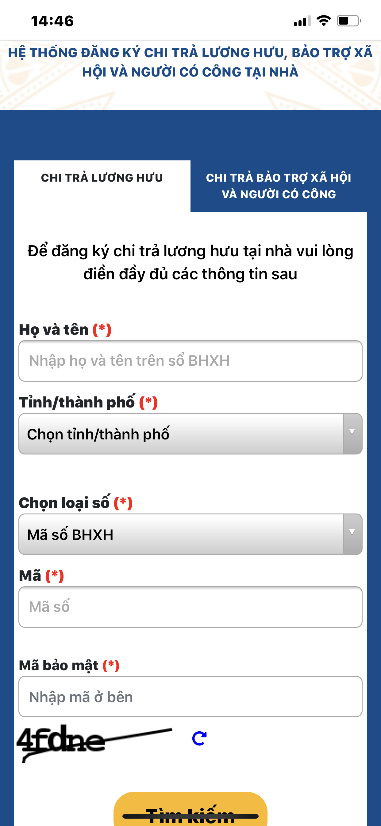 - Lựa chọn loại chi trả: người có công hoặc bảo trợ xã hội.