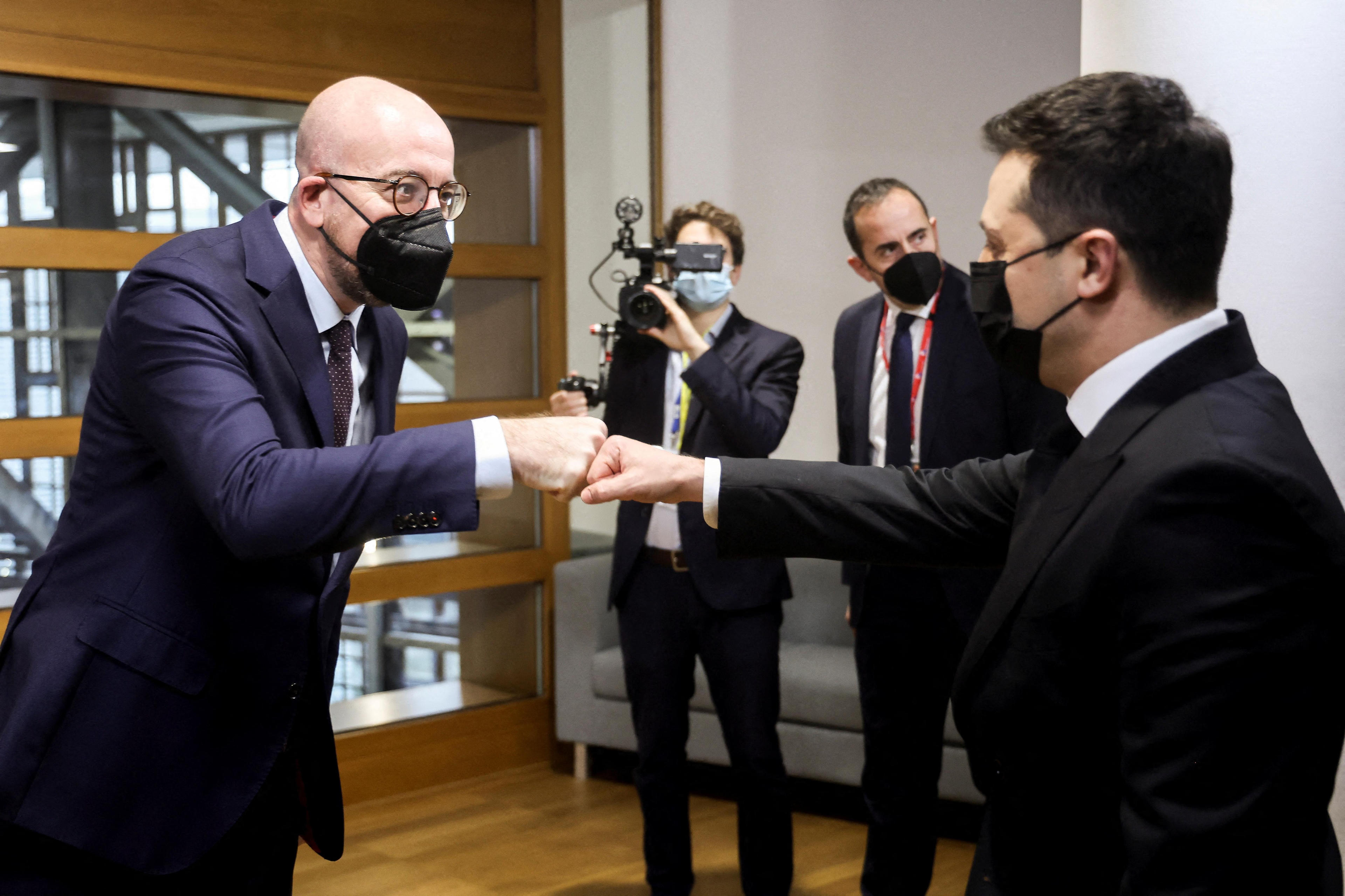 Chủ tịch Hội đồng châu Âu Charles Michel chào mừng Tổng thống Ukraine Volodymyr Zelenskiy trước cuộc họp giữa lãnh đạo các nước EU và chính phủ của "Đối tác phương Đông" ngày 15/12/2021. Ảnh: Reuters