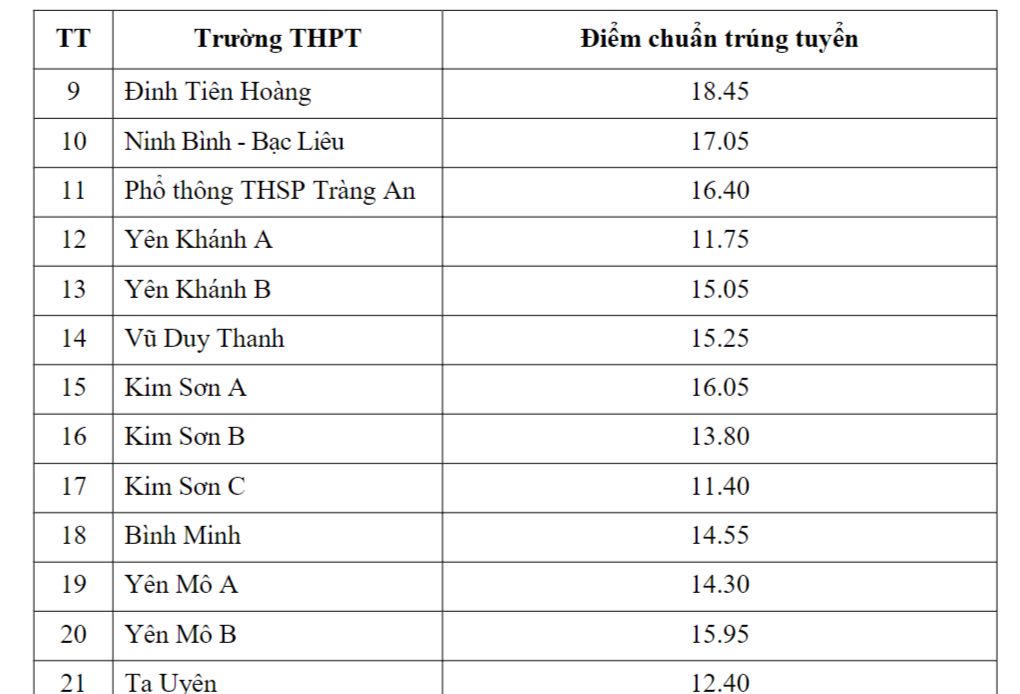 Trường THPT có điểm chuẩn cao nhất là THPT Đinh Tiên Hoàng với 18,45 điểm, thấp nhất là Trường THPT Dân tộc nội trú Cúc Phương với 11,05 điểm.