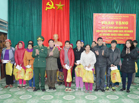 Trong 2 ngày 24 và 25/1, đoàn công tác của Bộ chỉ huy BĐBP Nghệ An đã có mặt tại xã Bắc Lý (huyện Kỳ Sơn), xã Tam Hợp (huyện Tương Dương) và xã Môn Sơn (huyện Con Cuông) thăm và chúc tết, tặng 300 suất quà cho đồng bào nghèo tại đây.