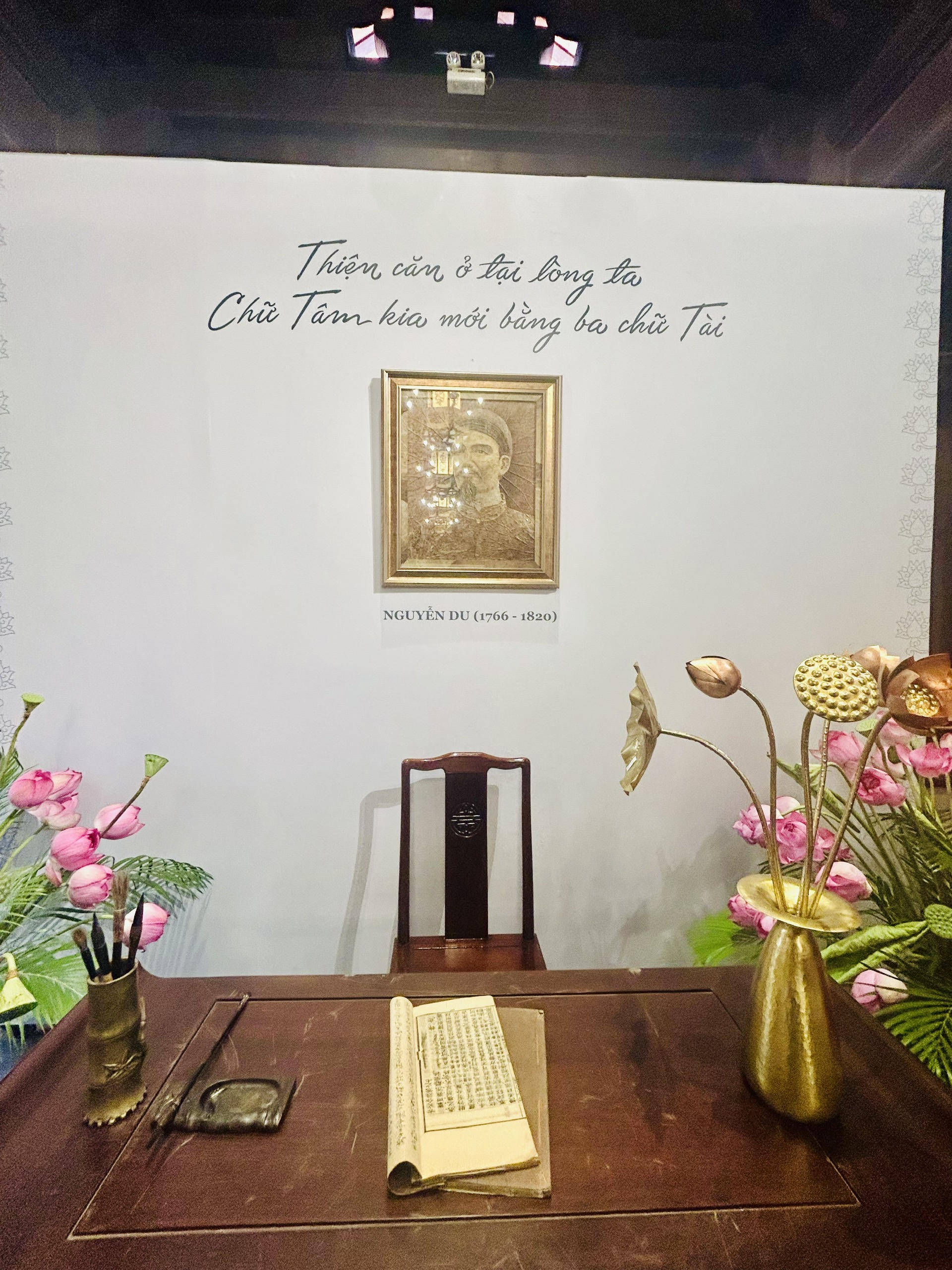 Không gian trưng bày cũng giới thiệu bức chân dung đại thi hào Nguyễn Du được chế tác từ lá sen khô giúp người xem hình dung về không gian thư phòng của một bậc nho gia, khiêm nhường mà thanh cao.