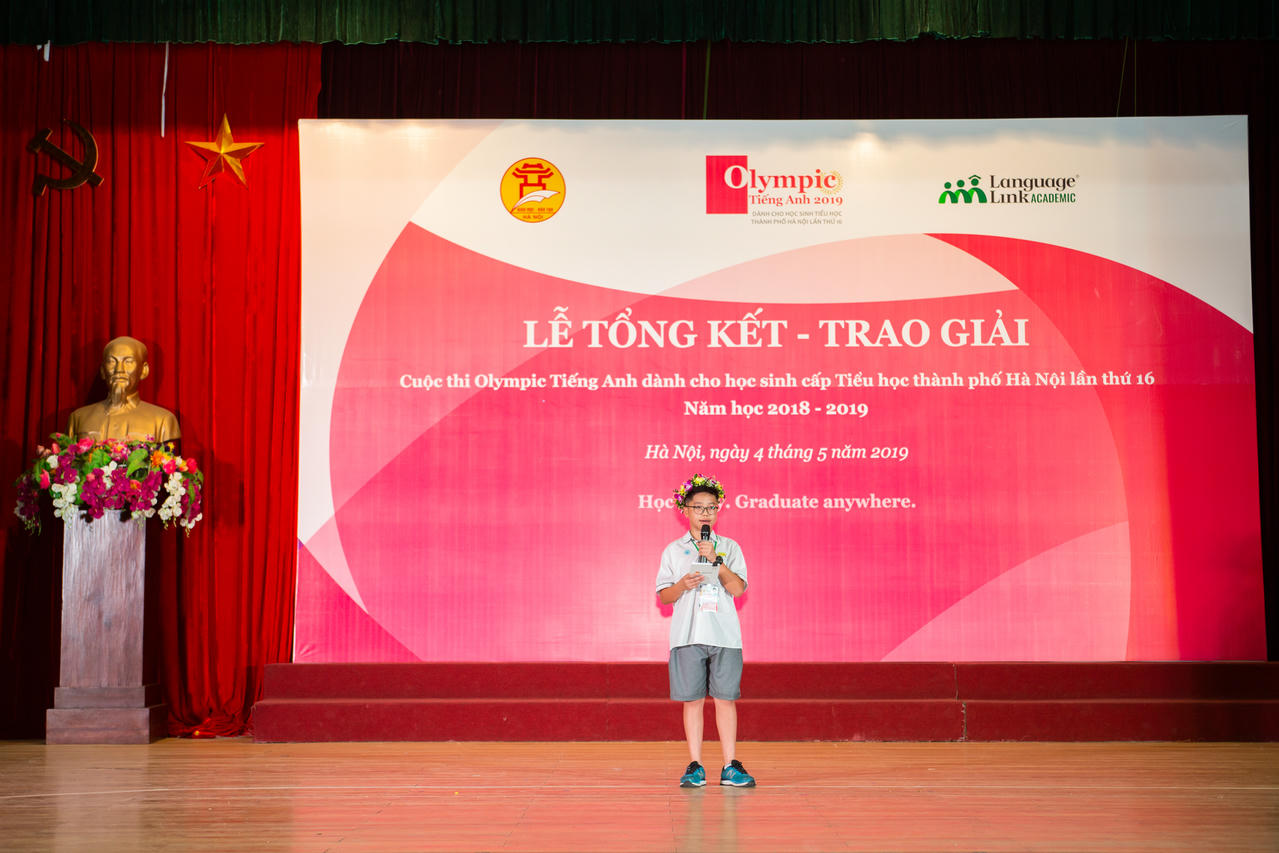 (PLVN) - Lễ trao giải “Cuộc thi Olympic Tiếng Anh Tiểu học” lần thứ 16 do Tổ chức giáo dục Language Link Việt Nam đồng hành cùng Sở Giáo dục & Đào tạo Hà Nội tổ chức vừa diễn ra tại Hà Nội. Quán quân cuộc thi năm nay là em Mai Phúc Huy, học sinh trường Tiểu học Lê Quý Đôn quận Hà Đông với số điểm 149,5/160.