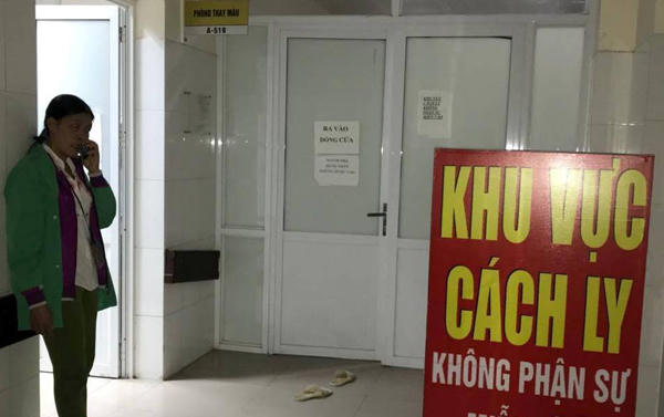 Người nhà các bé sơ sinh điều trị ở Bệnh viện Sản Nhi Bắc Ninh chờ đợi trước cửa khu vực cách ly. Ảnh: Nam Phương. |