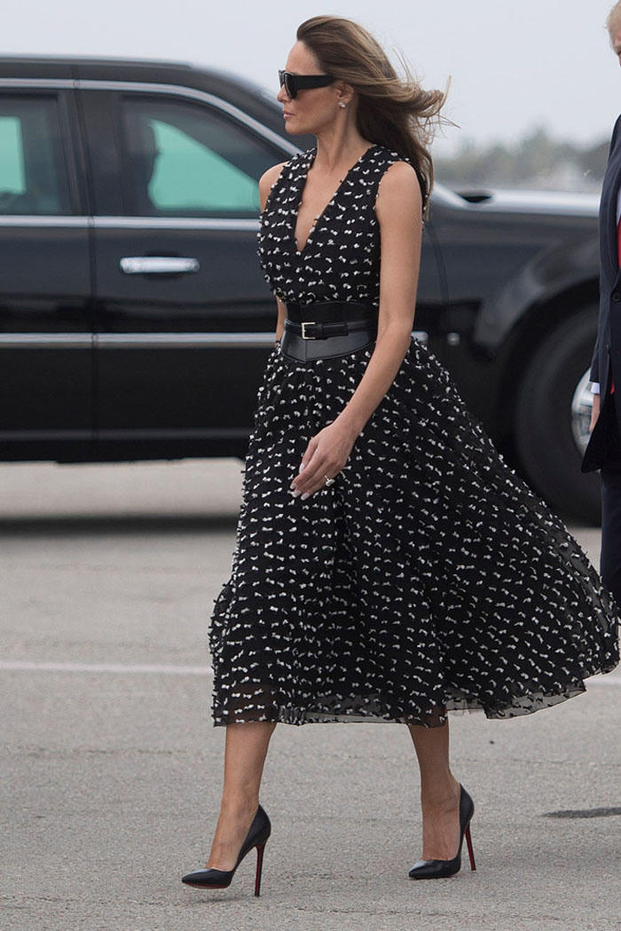 Đệ nhất phu nhân Hoa Kỳ diện đầm xòe bồng và giày cao gót ở phi trường, mùa hè năm 2017 (Ảnh: Getty Images)