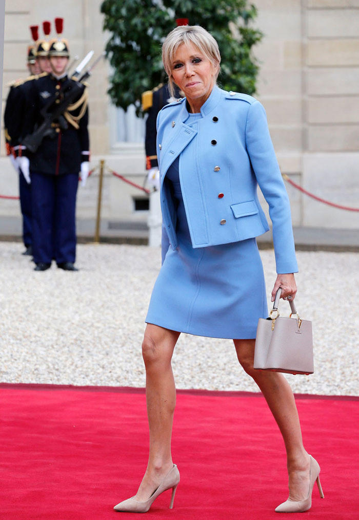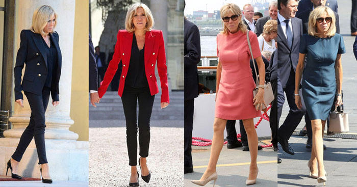 Một chiếc blazer với quần dài hay đầm liền ngắn tay là lựa chọn của Brigitte Macron.