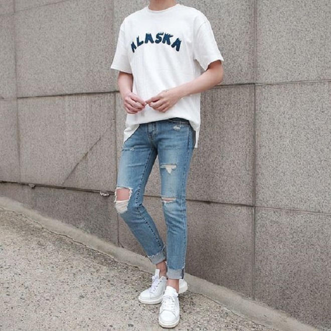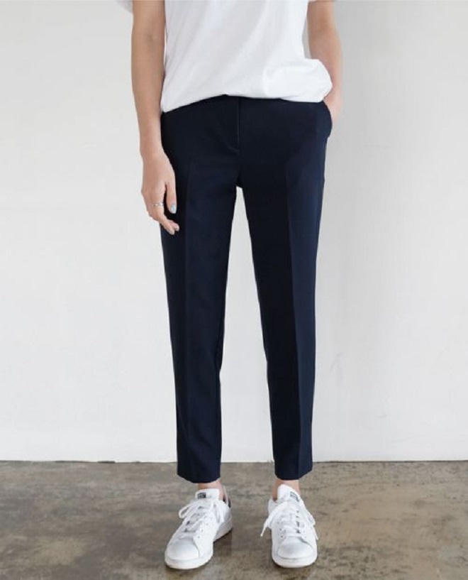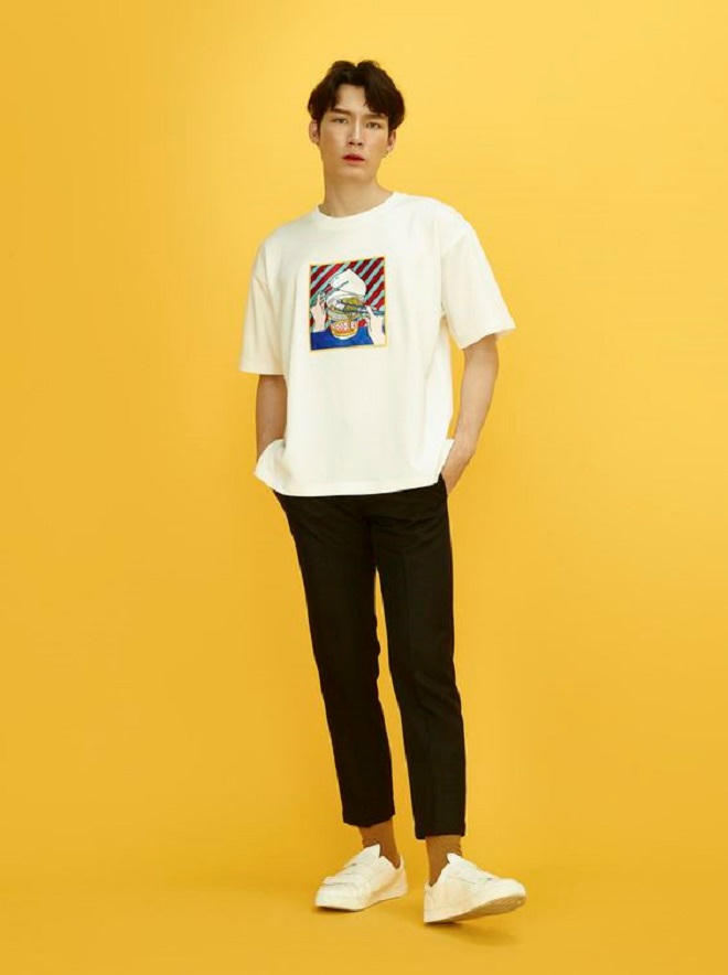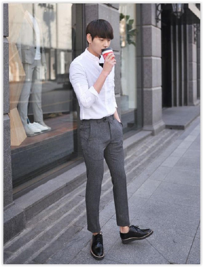 Phái mạnh thường e dè trong việc kết hợp sneakers trắng và quần tây, áo thun, nhưng với phong cách thời trang Hàn Quốc, điều này là bình thường. Bạn có thể phối hợp quần tây cropped ngắn trên mắt cá với giày sneakers, tránh kiểu quần tây ôm hoặc rộng thùng thình.
