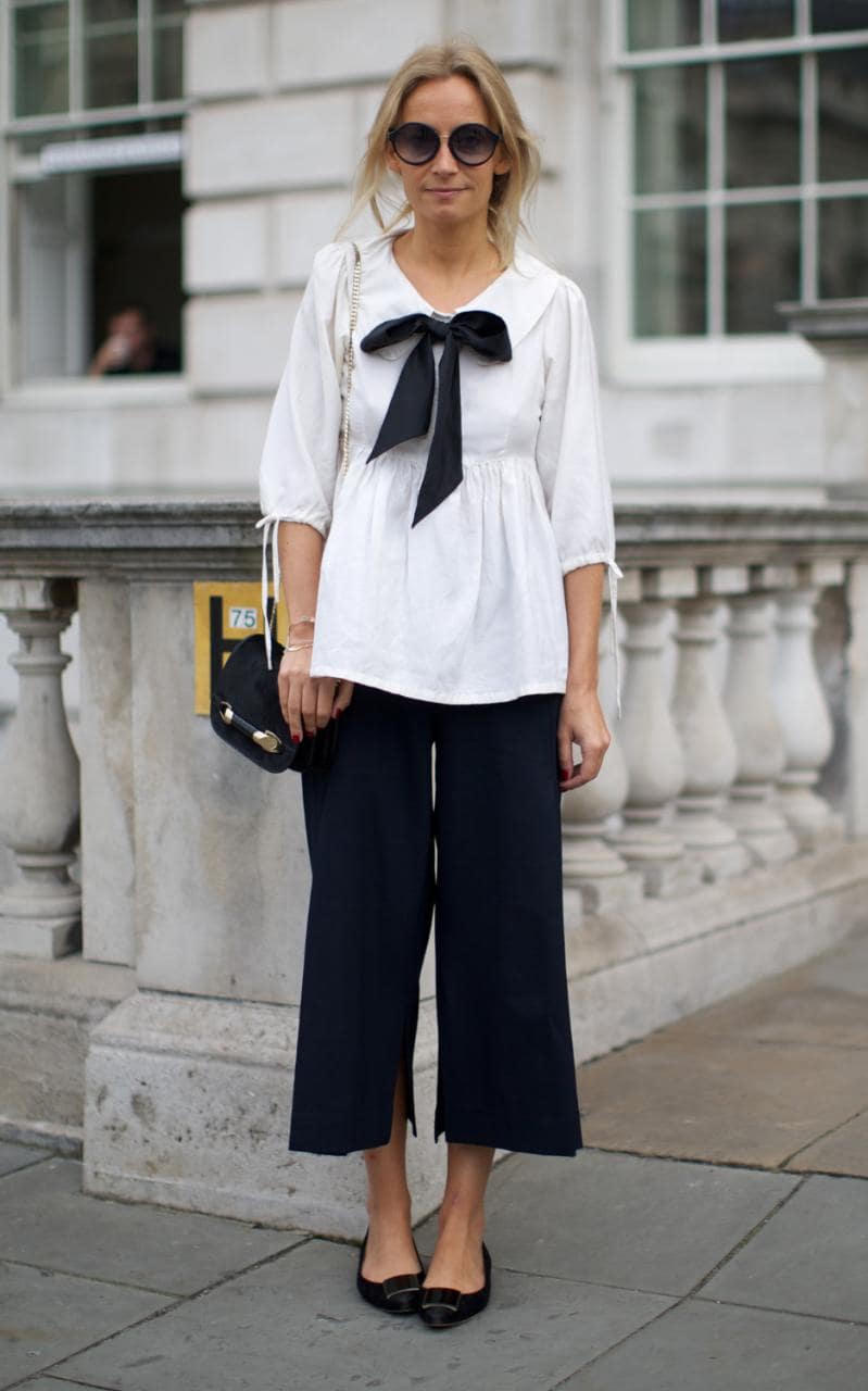 Đen và trắng, chiếc nơ nhấn nhẹ duyên dáng cho một kết hợp thoáng đãng hơn của loại áo này.