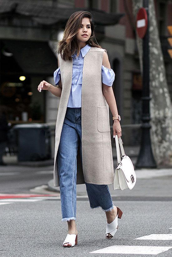Mặc áo long vest bên ngoài để nâng đỡ cho áo trễ vai bên trong.
