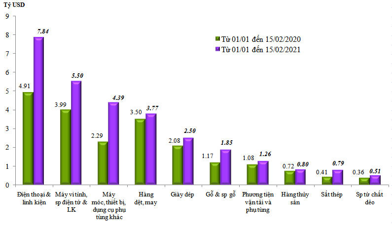 Lũy kế từ đầu năm đến 15/2, tổng kim ngạch xuất khẩu cả nước đạt 38,46 tỷ USD, tăng mạnh gần 36,9% so với cùng kỳ 2020, tương đương con số tăng thêm hơn 10 tỷ USD.
