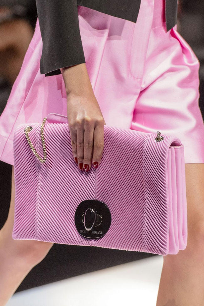 Dáng túi khỏe khoắn nhưng không kém phần nữ tính với màu hồng pastel từ thương hiệu Giorgio Armani.