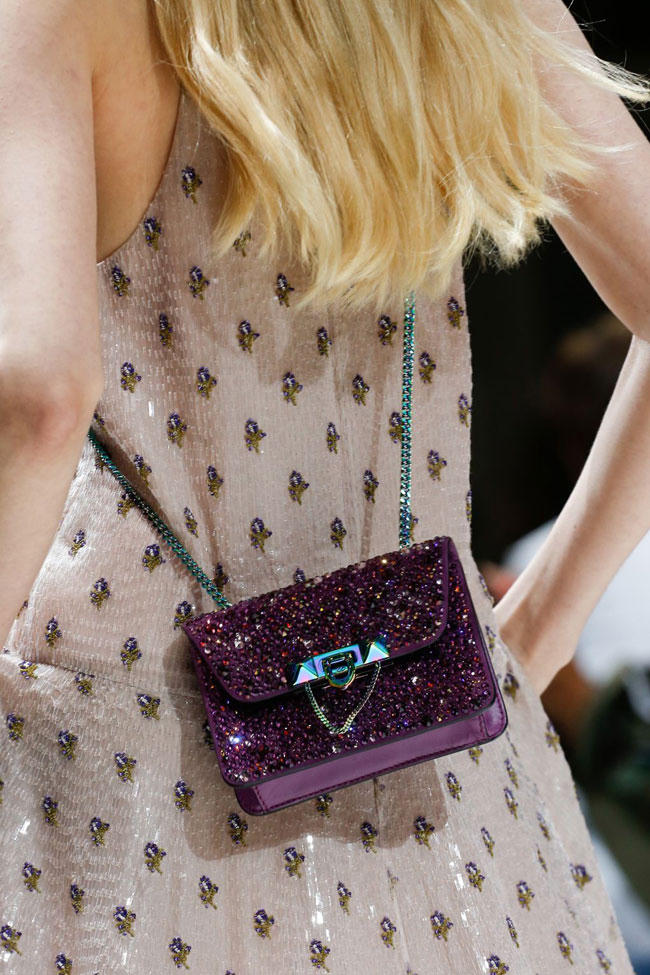 Túi xách là món phụ kiện không thể thiếu đối với phái đẹp. Item này ngày càng có thiết kế đa dạng, có thể chiều lòng mọi tín đồ thời trang. Xuất hiện với tần suất dày đặc trên sàn diễn thời trang xuân hè 2018 phải kể đến kiểu túi có kích thước siêu nhỏ. Trong ảnh là mẫu micro bag đính sequin của Valentino.