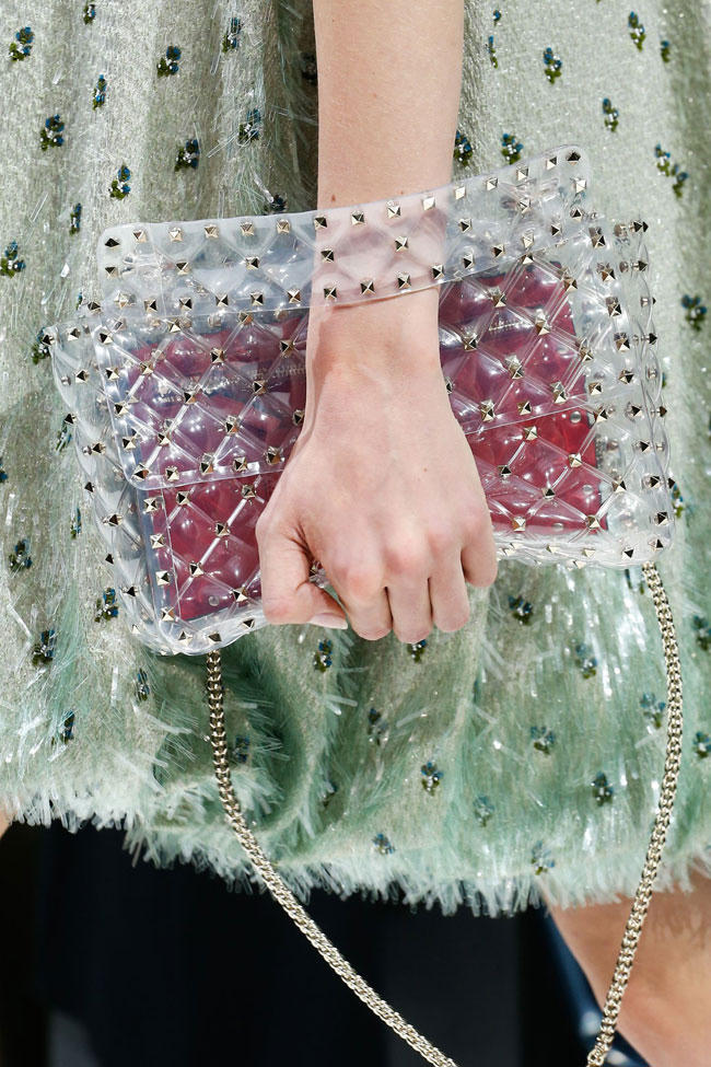 Túi trong suốt có thể phù hợp với nhiều phong cách từ điệu đà, thanh lịch đến cá tính, nổi loạn nên chắc chắn sẽ là item chiếm được cảm tình của các fashionista trong năm 2018. Trong ảnh là mẫu túi trong suốt kết hợp đinh tán của Valentino.