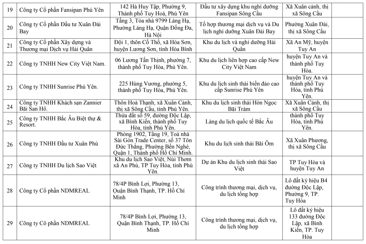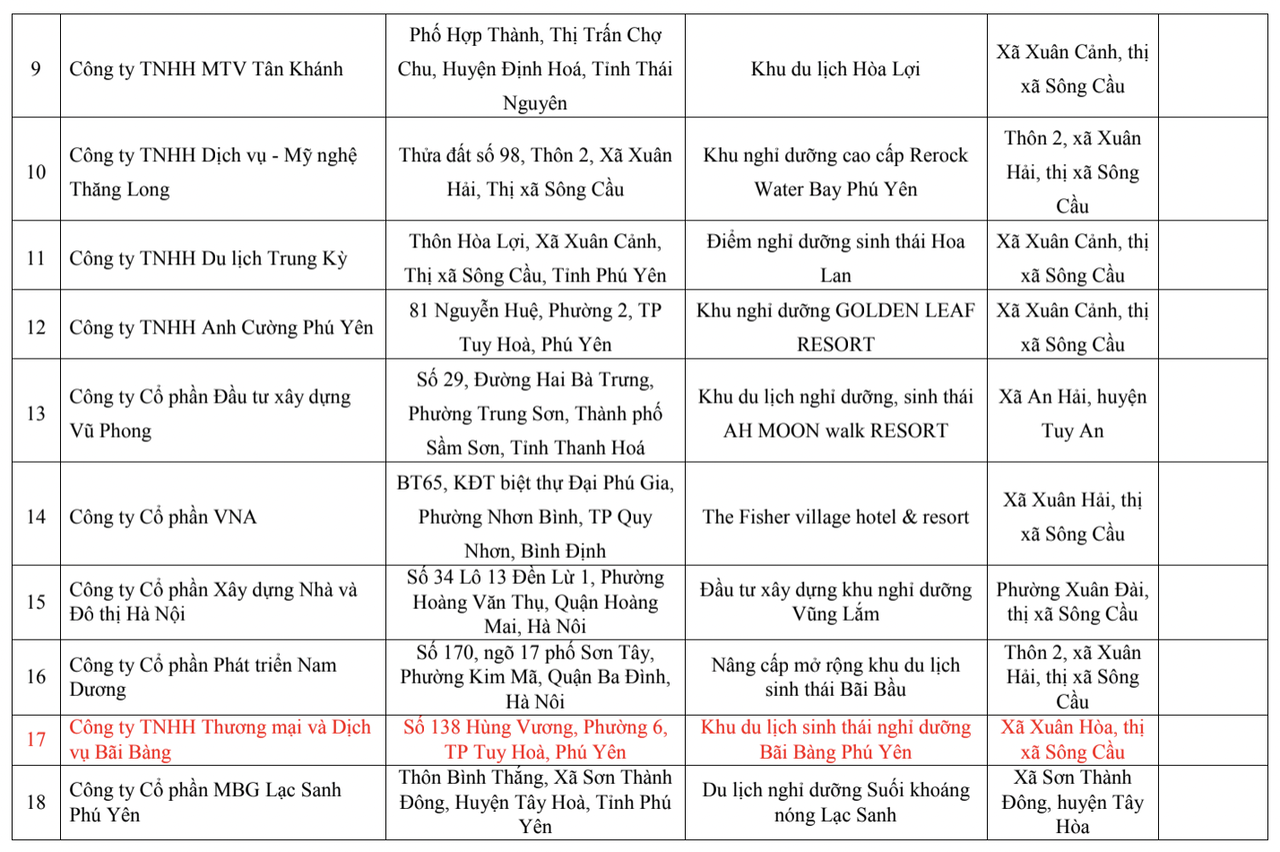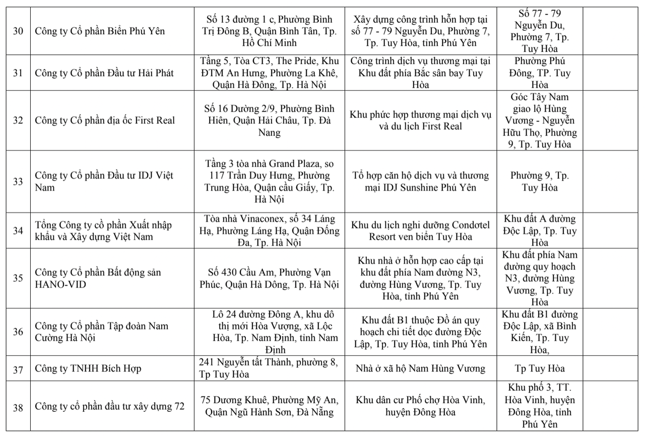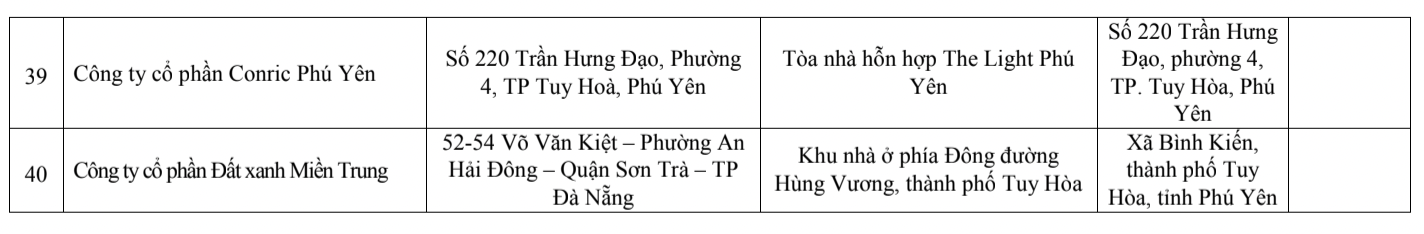 Danh sách 40 dự án bị vi phạm Nghị định số 117/2015 của Chính phủ được Sở Xây dựng Phú Yên liệt kê:
