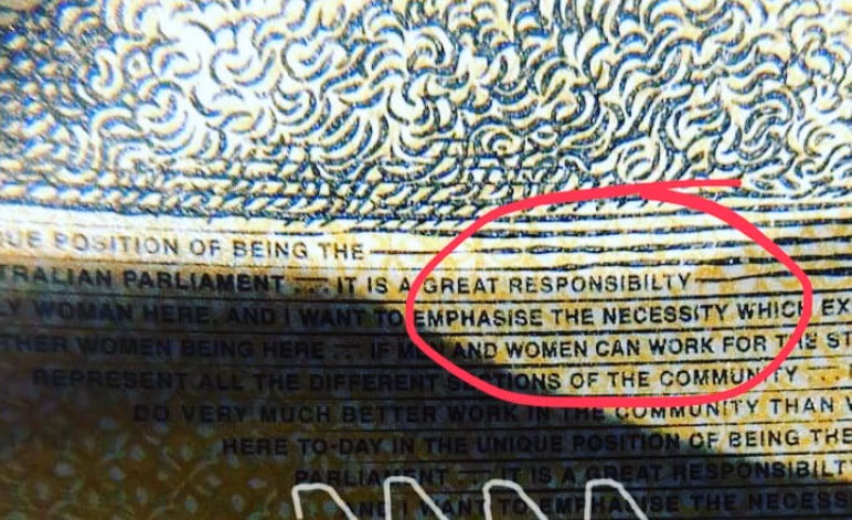 Lỗi đánh máy này, rất khó để nhận ra bằng mắt thường, được in siêu nhỏ bên cạnh chân dung của bà Edith Cowan – thành viên nữ đầu tiên trong Quốc hội Australia. Đoạn chữ siêu nhỏ này được trích dẫn từ bài phát biểu chính thức đầu tiên của bà trước quốc hội.