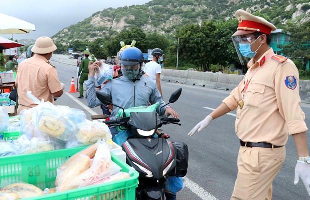 Lực lượng chốt kiểm soát Cà Ná, huyện Thuận Nam thực hiện kiểm tra phòng, chống dịch đối với công dân về từ các tỉnh, thành phía Nam đang thực hiện giãn cách xã hội. (Ảnh: Công Thử/TTXVN)