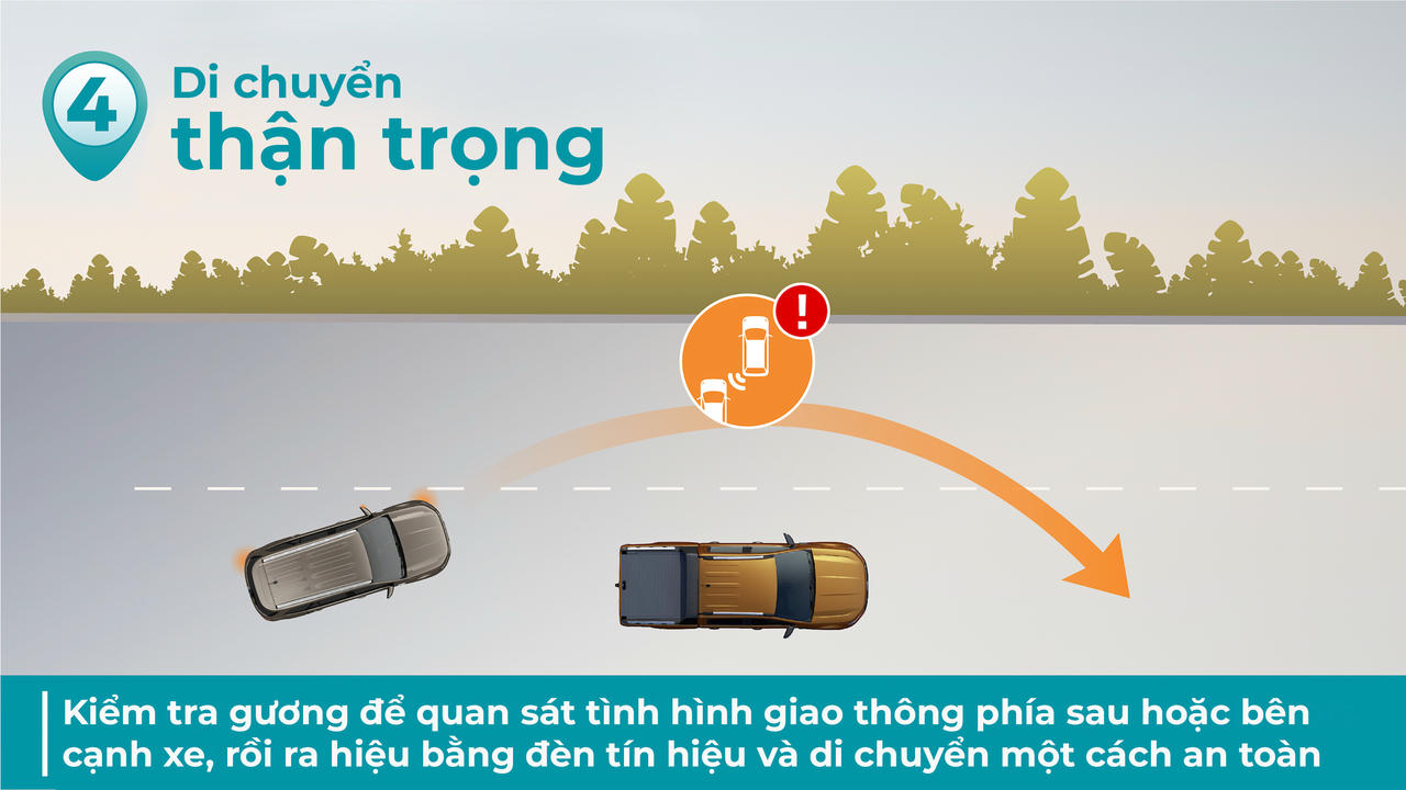 Khi vượt, hãy nhớ kỹ ba thao tác sau: “Nhìn gương, ra tín hiệu, di chuyển”. Trước tiên, kiểm tra gương để quan sát tình hình giao thông phía sau hoặc bên cạnh xe. Sau đó, ra hiệu bằng đèn tín hiệu và di chuyển một cách an toàn.