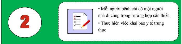 2. Mỗi người bệnh chỉ có 1 người nhà đi cùng trong trường hợp cần thiết. Thực hiện việc khai báo y tế trung thực.
