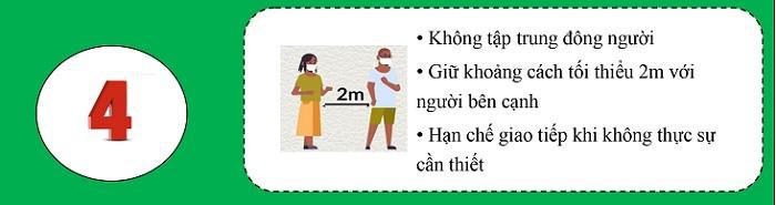 4. Không tập trung đông người. Giữ khoảng cách tối thiểu 2m với người bên cạnh. Hạn chế giao tiếp khi không thực sự cần thiết.