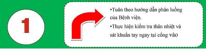 1. Tuyệt đối tuân thủ theo hướng dẫn phân luồng của bệnh viện. Thực hiện kiểm tra thân nhiệt và sát khuẩn tay ngay tại cửa vào.