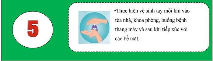 5. Thực hiện vệ sinh tay mỗi khi vào tòa nhà, khoa phòng, buồng bệnh thang máy và sau khi tiếp xúc với các bề mặt.