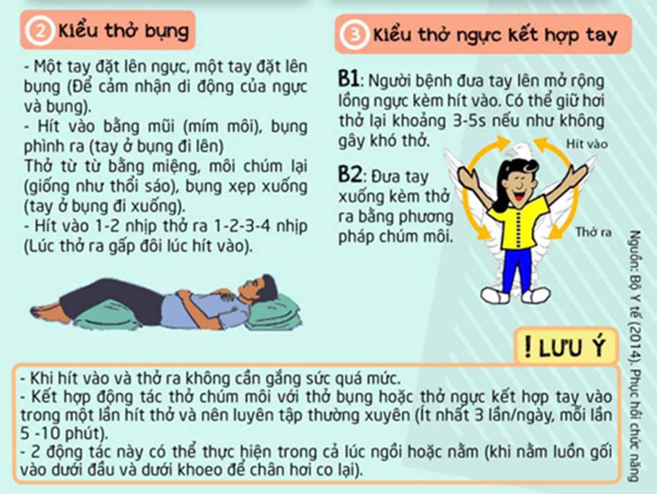 Ngoài những bài tập thể dục vận động mạnh, bạn cũng có thể thực hiện các bài tập thở để tăng cường sức khỏe hô hấp như: thở chúm môi, thở bụng, thở ngực kết hợp tay…