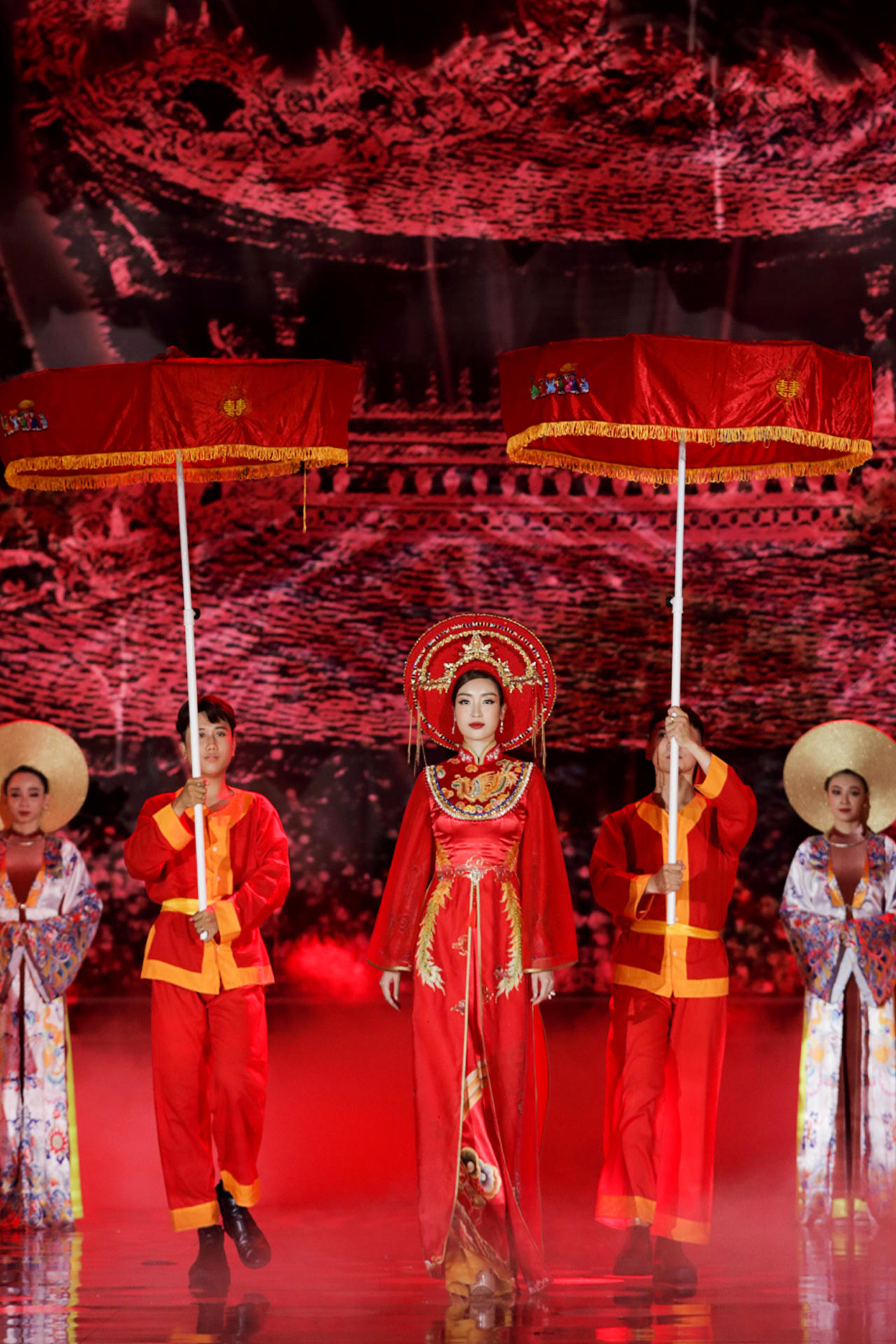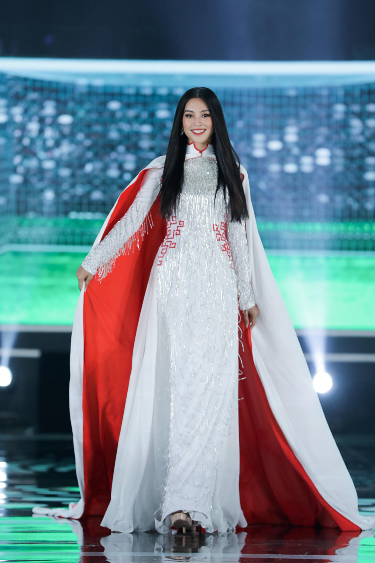 Áo dài và mấn đội màu đỏ càng khiến Hoa hậu Việt Nam 2016 nổi bật một cách tươi đẹp. phần trình diễn của cô sẽ để lại dấu ấn đặc biệt khó quên. Nàng hậu tỏ ra lăn xả hết mình vì đêm cuối hành trình HHVN 2020.