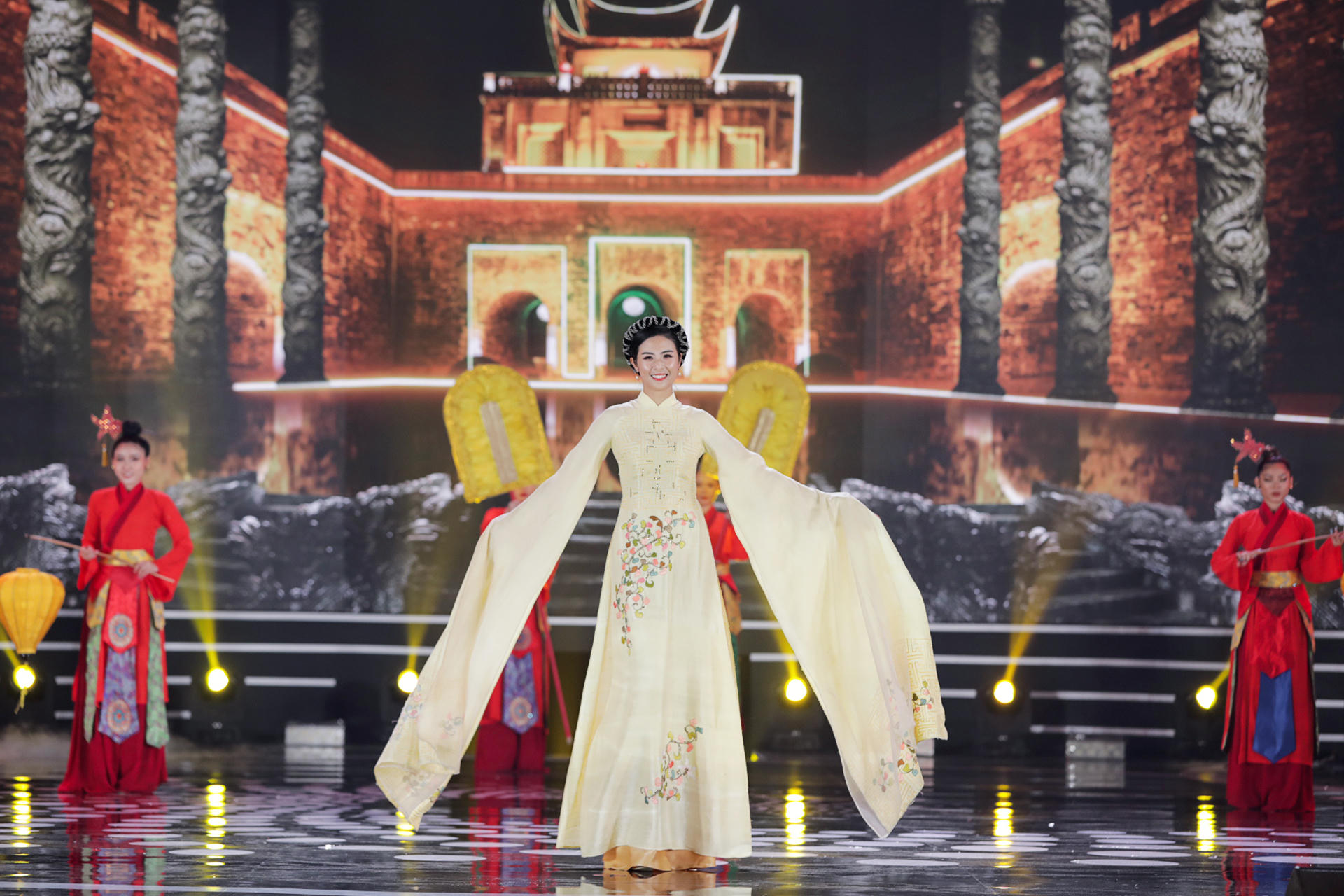 Khởi đầu phần trình diễn áo dài, Hoa hậu Ngọc Hân duyên dáng tự hào sải những bước chân với áo dài họa tiết hoàng thành Thăng Long. Chiếc áo dài mang thông điệp kỷ niệm 1.000 năm Thăng Long - “Nghìn năm hương sắc” ở năm 2010. Đặc biệt, cô đích thân tự tay thiết kế cho bản thân và thí sinh BST áo dài này. Chất liệu chủ đạo là tơ tằm Vạn Phúc mềm mại được trực tiếp dệt thủ công.