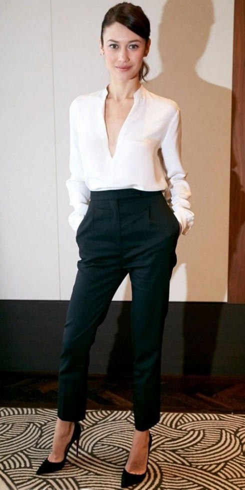 Với đặc trưng phần hông hơi phồng, phần dưới ôm chân, những chiếc áo sơ mi màu trắng đơn giản hơi ôm người kết hợp với giày cao gót mũi nhọn quả thực rất tinh tế.