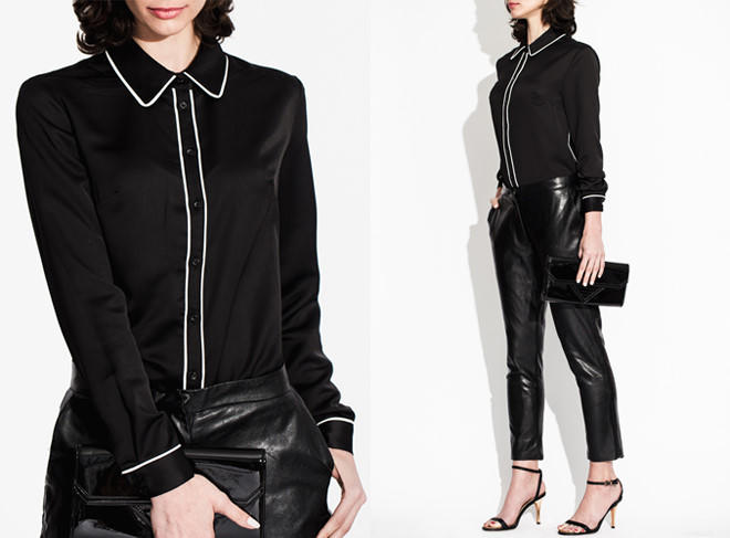 Hoặc ngược lại, nếu mọi người đã quen mắt với phong cách hiện đại, trẻ trung cùng chiếc áo sơ mi chừa vài khuy không cài cúc, hãy thử nghiệm kiểu “kín cổng cao tường”. Đây cũng là cách để các cô nàng công sở thêm thanh lịch và sang trọng. Kết hợp quần da đen đang rất mốt trong năm nay, bạn sẽ trở nên sành điệu, khác lạ hơn hẳn.