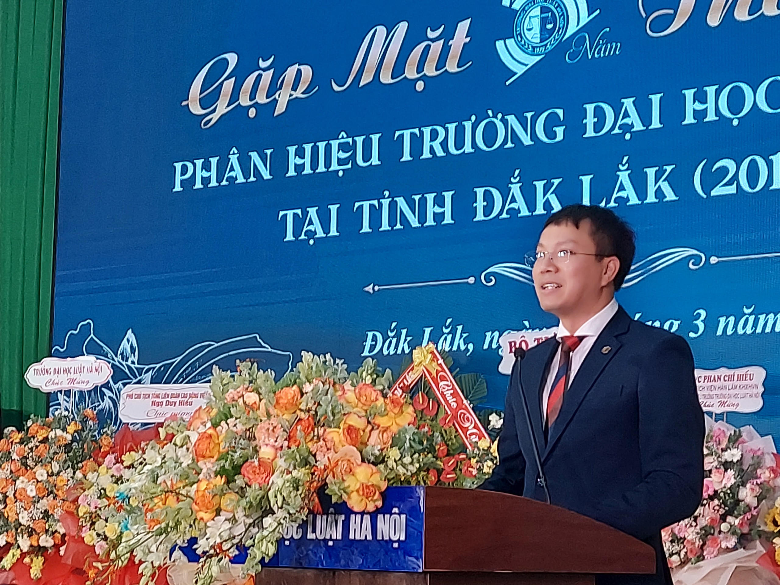 Kết quả trên là minh chứng khẳng định chủ trương của Ban Cán sự Đảng, Lãnh đạo Bộ Tư pháp về việc giải thể Trường Trung cấp Luật Buôn Ma Thuột để thành lập Phân hiệu Trường Đại học Luật Hà Nội tại tỉnh Đắk Lắk là đúng đắn, đồng thời kết quả trên cũng đặt nền móng vững chắc để Phân hiệu tự tin, vững bước trong giai đoạn phát triển mới. Không chỉ cá nhân tôi với tư cách là Phó Giám đốc phụ trách Phân hiệu, mà có lẽ tập thể các thầy giáo, cô giáo, viên chức, người lao động và các em học viên, sinh viên đều cảm thấy vinh dự, tự hào và trong Buổi Gặp mặt hôm nay mong muốn được bày tỏ sự trân trọng, lòng biết ơn và cảm ơn tới các quý vị lãnh đạo Trung ương và địa phương...