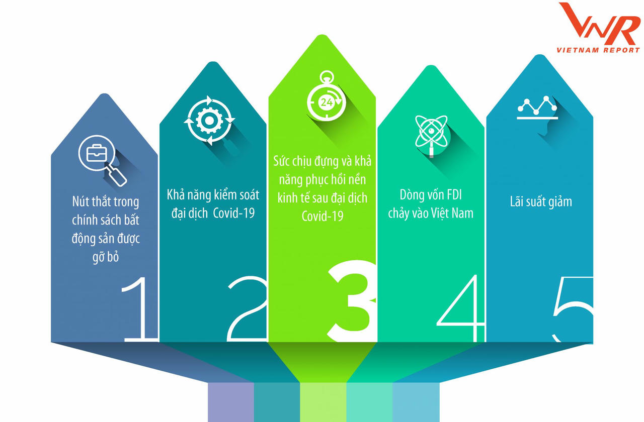 5 yếu tố bao gồm: Nút thắt trong chính sách bất động sản được gỡ bỏ; Khả năng kiểm soát dịch bệnh; Sức chịu đựng và khả năng phục hồi nền kinh tế sau đại dịch Covid-19; Dòng vốn FDI chảy vào Việt Nam; Lãi suất giảm.