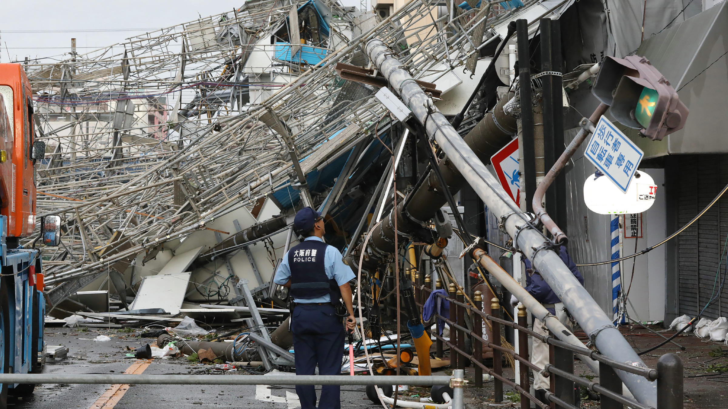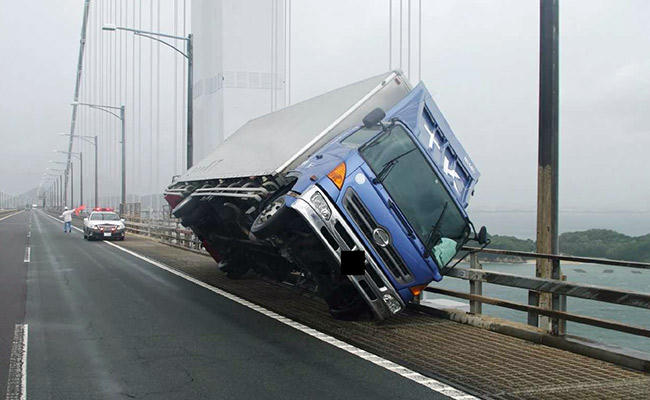 Bão cũng đã xô con tàu có tải trọng 2.591 tấn Houn Maru va vào cây cầu dài 3,7km, làm hư hại tuyến đường duy nhất nối sân bay với đất liền.