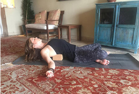 Đặt vật kê dưới bả vai gần khung xương sường và dưới đầu. Mở tay sang hai bên, bắt chéo chân. Nếu hông cảm thấy không thoải mái, bạn hãy để bàn chân chạm sàn, cong đầu gối. Hít thở trong 2 phút.