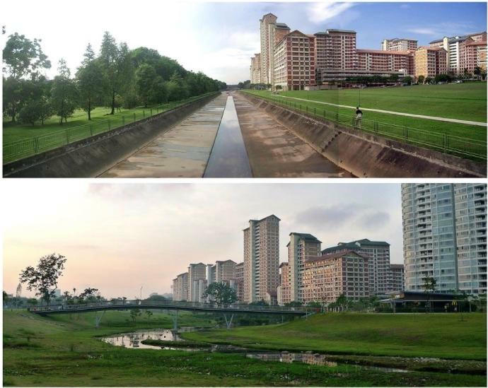 Một vài thập kỷ trước, thành phố đã quyết định phân luồng sông Kallang tạo ra một con kênh bằng bê tông và đi kèm là hệ thống ngăn cách làm ranh giới phân chia rõ ràng giữa công viên và cộng đồng dân cư. Khi con kênh bê tông này cần được nâng cấp, thay vì bảo trì con kênh như thiết kế ban đầu, cơ quan cấp nước quốc gia của Singapore đã quyết định tự nhiên hóa dòng sông bằng cách khôi phục lại lòng sông và vùng ngập nước như trước. Kênh thoát nước bê tông thẳng 2,7km đã bị phá bỏ và biến thành một con sông tự nhiên uốn khúc dài 3,2km.