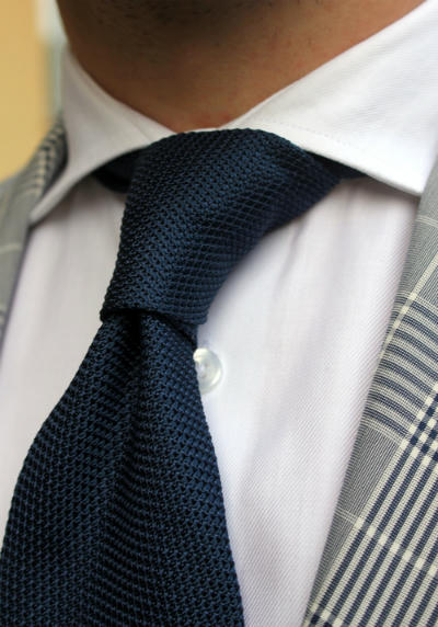 Cà vật vân nổi màu navy dễ kết hợp với sơ mi và áo khoác các màu và có thể dùng trong nhiều hoàn cảnh khác nhau. Ảnh:Dresslikea. |