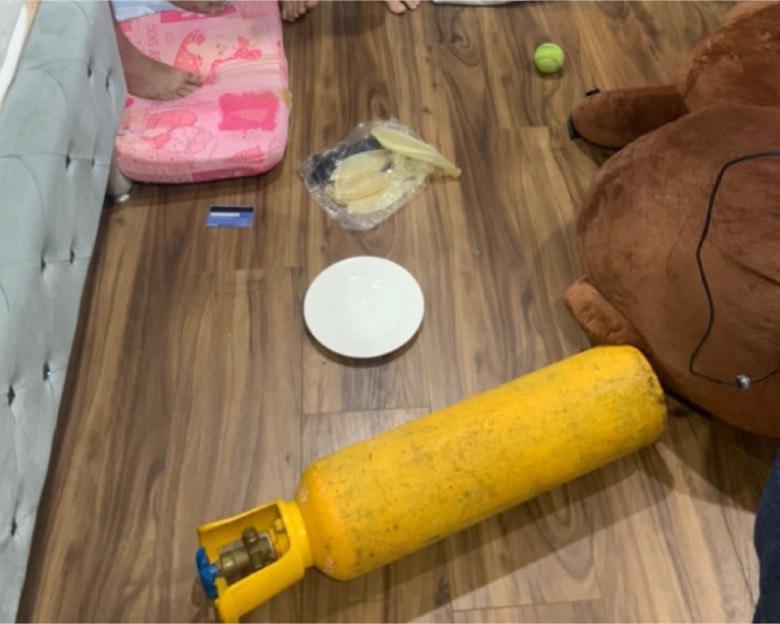 Thời điểm Cảnh sát ập vào, phát hiện sàn nhà có đĩa để sử dụng hàng khay ketamine và bình khí nén để hút bóng cười. |