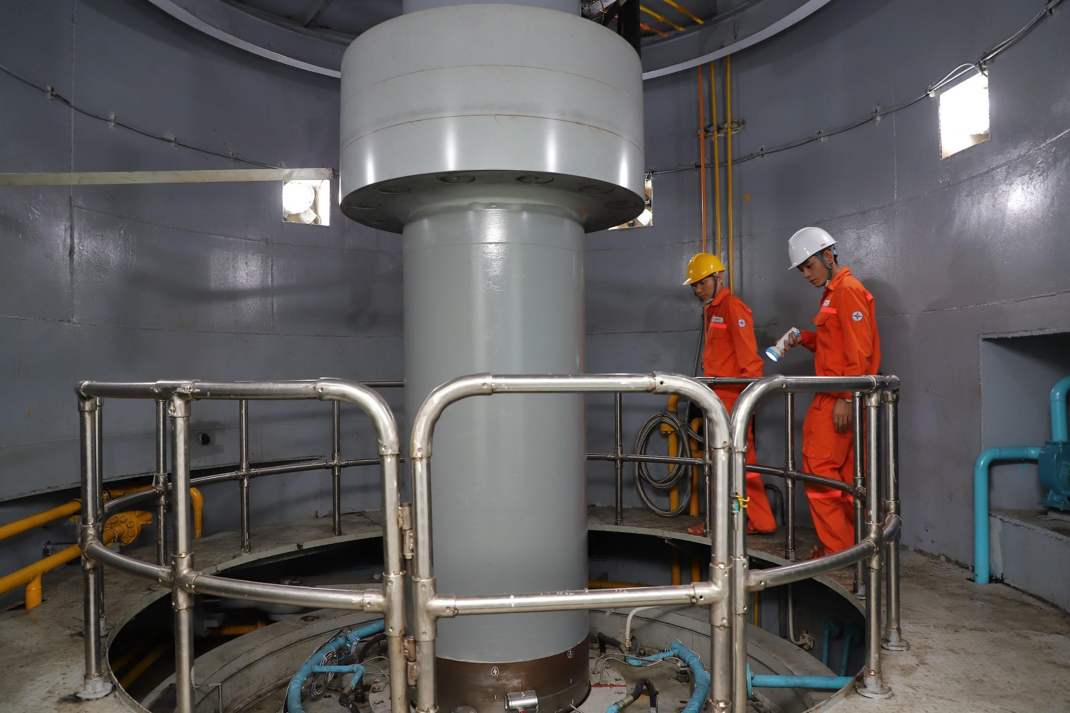 | Nhân viên vận hành Công ty Thủy điện Sông Bung kiểm tra hệ thống tuabin thủy lực. Ảnh: Minh Lương |