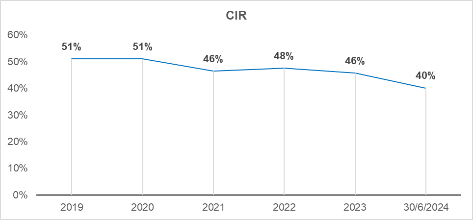 Tỷ lệ chi phí/tổng thu nhập hoạt động (CIR) tại NAB trong quý 2/2024 đã có sự cải thiện hiệu quả, CIR quý 2 về sát mốc 40% - mức thấp nhất trong 5 năm gần đây.