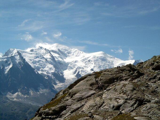 Nóc nhà Tây Âu có độ cao chỉ gần một nửa nếu so với các đỉnh trên dãy Himalaya. Đỉnh nằm trên dãy Alps, có tên được dịch ra tiếng Việt là Núi Trắng. Về kỹ thuật, việc leo lên Mont Blanc không quá khó nhưng vẫn có người tử vong tại đây hàng năm do tuyết lở và điều kiện thời tiết xấu. Mont Blanc lần đầu tiên được chinh phục vào năm 1786 bởi Jacques Balmat và Michel-Gabriel Paccard người Pháp. Ngày nay, ngọn núi được khoảng 35.000 nhà leo núi đến thăm hàng năm và khoảng 100 người trong đó thiệt mạng. Ảnh: Tinelot Wittermans