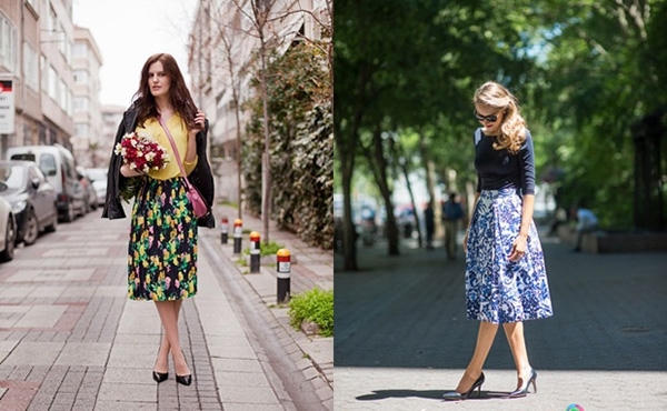 Vẫn tiếp tục "làm mưa làm gió" trên thị trường thời trang mùa hè, chân váy xoè cổ điển năm nay chủ yếu là những thiết kế midi có độ dài ngang gối cùng hoạ tiết hoa nổi sáng màu.