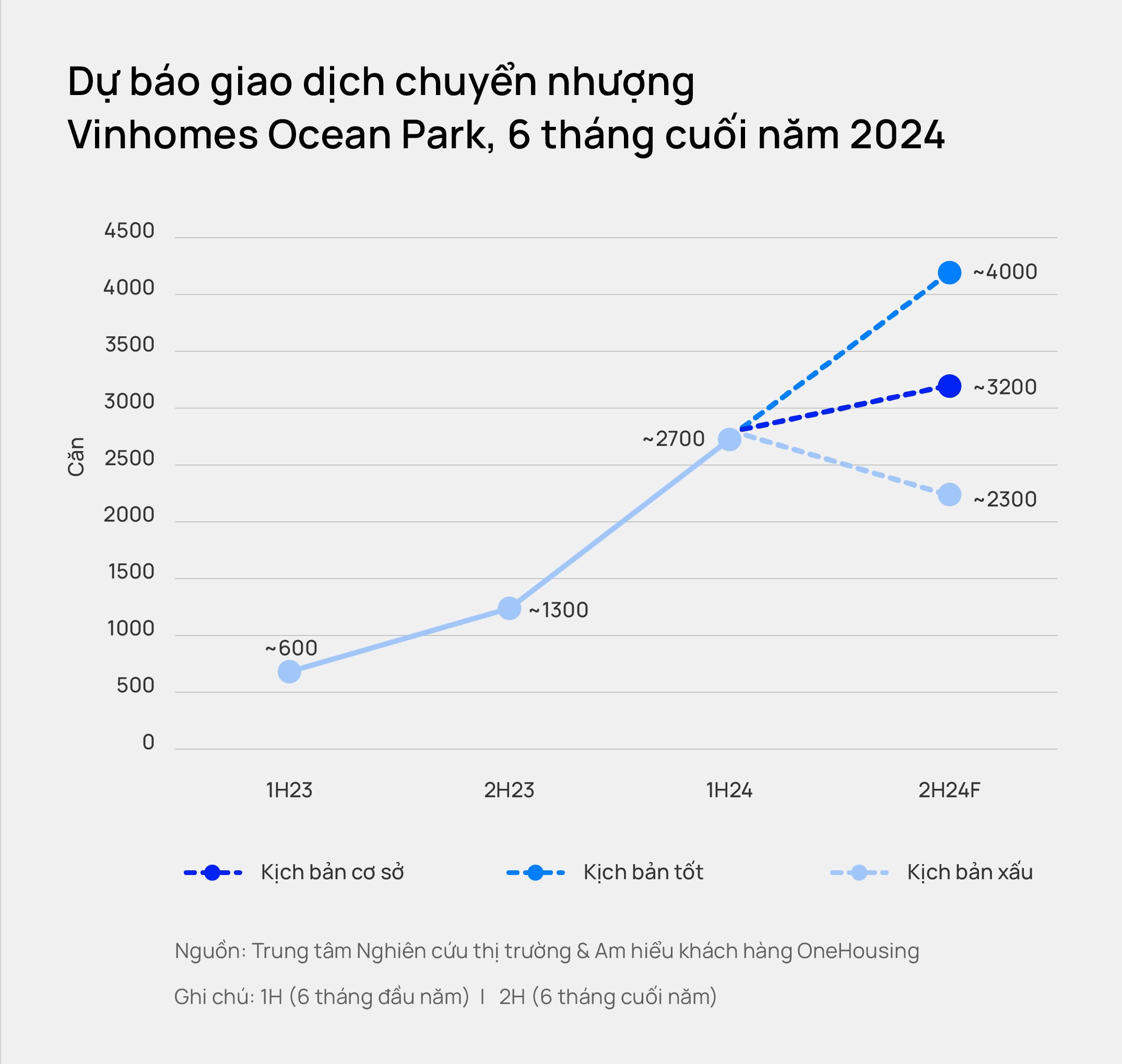Về các giao dịch chuyển nhượng chung cư, trong 6 tháng cuối năm 2024, Vinhomes Ocean Park và Vinhomes Smart City được dự báo có lượng giao dịch tăng nhẹ hoặc đi ngang so với 6 tháng đầu năm 2024, có hai lý do: giai đoạn cuối năm thường là thời điểm có lượng giao dịch nhiều hơn so với đầu năm và mặt bằng giá chuyển nhượng đang hấp dẫn hơn so với các sản phẩm sơ cấp.
