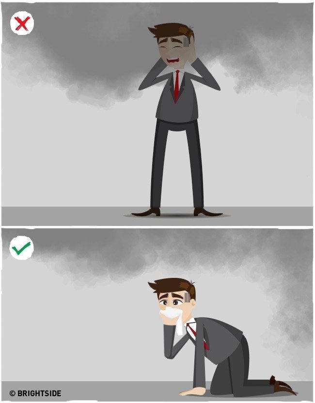 Các chuyên gia lưu ý rằng mối đe dọa lớn nhất trong một vụ cháy là khí carbon monoxide, chứ không phải là bị bỏng. Để tránh hít phải khí độc, hãy ở gần sàn nhà nhất có thể, cho tới khi bạn ra khỏi khu vực nguy hiểm.