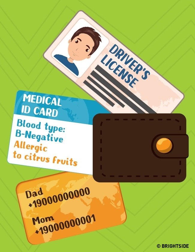 Hãy đảm bảo là luôn mang theo chứng minh thư. Những thông tin mang theo nên gồm cả thông tin y tế như nhóm máu, phản ứng dị ứng… Bằng cách này, nếu có chuyện đột ngột xảy ra, thì một người lạ cũng có thể giúp đỡ bạn một cách nhanh chóng. Đừng quên danh sách liên lạc cá nhân như số điện thoại của những người cần được thông báo khi bạn gặp nguy hiểm.
