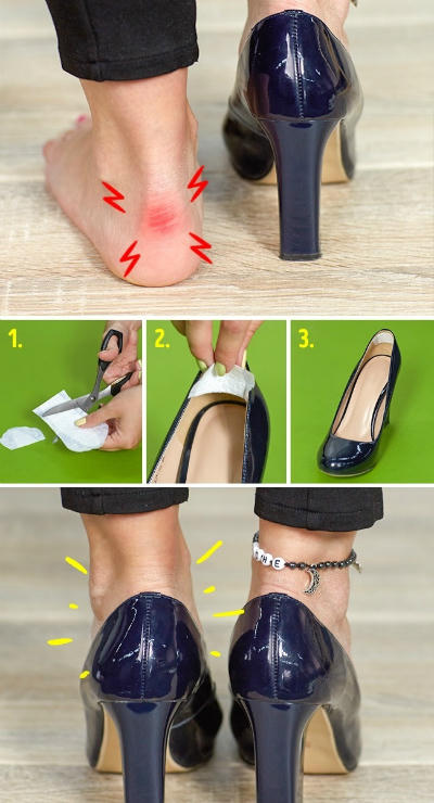 1. Nếu không có sẵn cao dán, cắt một miếng băng vệ sinh và dán vào giày để tránh đau gót chân.