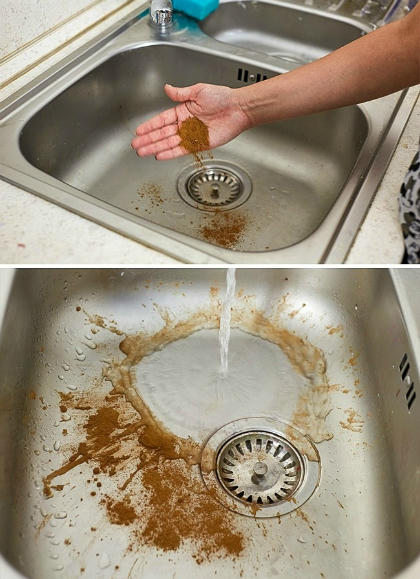 8. Đổ một ít bột gia vị, tốt nhất là bột quế, vào bồn và xả sạch bằng nước nóng để khử mùi hôi trong bếp.