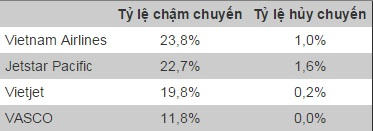 Vietnam Airlines dẫn đầu về tỷ lệ chậm chuyến với 23,8%, còn VASCO chậm chuyến ít nhất. "Tàu bay về muộn" là lý do chính dẫn đến tình trạng này, với tỷ lệ khoảng 15%.