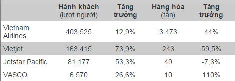 Riêng các hãng hàng không Viêt Nam vận chuyển gần 655.000 khách, tăng 28% so với cùng kỳ. Vietjet có lượng tăng trưởng về khách nhiều nhất với gần 74%. Jetstar Pacific cũng chứng kiến mức tăng trưởng mạnh.