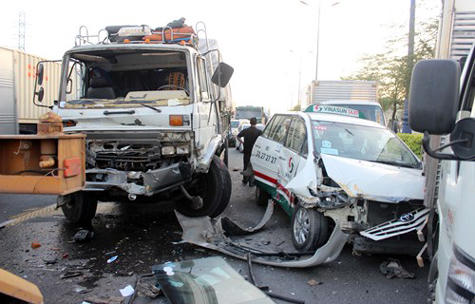 Tài xế taxi bị kính đâm bị thương, xa lộ Hà Nội ùn ứ kéo dài hơn 2 km. "Nếu taxi không lệch qua trái, đâm xược xe ben thì 4 người chúng tôi bị kẹp nát rồi", một hành khách trên taxi cho biết.